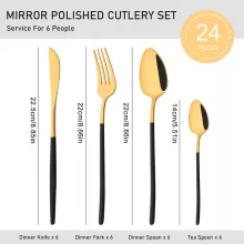 This set includes everything needed for a complete table setting for six people — six dinner forks, six dinner knives, six tablespoons, and six teaspoons. The sleek black handles paired with a rich gold finish create a sophisticated and bold statement, complementing any dinnerware or decor. With solid stainless steel construction, these utensils feel balanced, sturdy, and comfortable in hand, ensuring a pleasurable dining experience every time.