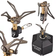 This folding stove is made with a smart combination of titanium, stainless steel, brass, and aluminum, offering both exceptional strength and lightweight portability. Weighing only 1.45 oz and folding down to just 2.05 x 1.3 inches, it’s compact enough to fit in your palm or your pack. Despite its minimal footprint, the stove handles loads up to 11 lbs, making it ideal for pots and pans of various sizes. Fueled by standard butane, it’s ready for action in any ordinary outdoor setting.