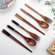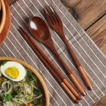 3-Piece Natural Wooden Cutlery Set – Fork, Spoon & Chopsticks
