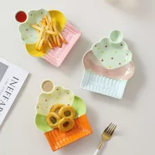 Bring a playful touch to your table with this cartoon cake-inspired ceramic dumpling and dessert plate. Designed with underglaze coloring and an irregular shape, this plate is a delightful mix of style and function. Its rainbow gradient finish adds a lively pop of color, making every snack or dessert look even more tempting. At 7 inches in diameter, it’s the perfect size for dumplings, cakes, fruits, or any small treat you want to serve in style.