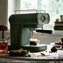 This espresso machine is a delight for home use, with its mint green color seamlessly matching other green decor in my kitchen. Its aesthetic and style complement our mint barrel front Keurig brewer beautifully.