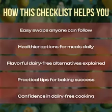 This checklist is designed for anyone looking for dairy-free recipe swaps—from home cooks managing allergies or intolerances, to plant-based foodies, to families who simply want healthier alternatives without giving up flavor. What makes it stand out is its focus on practical, ready-to-use solutions you can apply right away, rather than vague suggestions that leave you guessing.