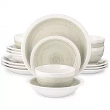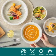 - Includes: Dinner plates (10.5 in), Dessert plates (7.5 in), Pasta bowls (8.3 in), Cereal bowls (5.6 in)
