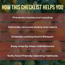 Unlike generic cleaning tips online, this digital checklist is crafted as a professional, easy-to-use resource that combines expert knowledge with practical application. It focuses on real, safe, and effective methods using items you already have at home, so you can confidently maintain your cutting boards without worrying about harmful chemicals or complicated steps.