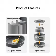 The set includes a complete range of non-stick pots, pans, and a handy teapot—everything you need for a satisfying breakfast, lunch, or dinner outdoors. With its foldable design and space-saving construction, it’s easy to pack, carry, and clean. The cookware’s round design also offers better heat distribution, so your meals cook evenly and quickly—saving both time and fuel.