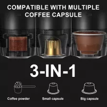 - 3-in-1 Brewing Compatibility: Works with ground coffee, small capsules, and large capsules for total versatility.