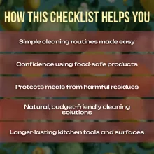 This checklist is perfect for home cooks, busy families, and anyone who values safe, healthy meal preparation. Unlike generic cleaning guides, it focuses exclusively on using food-safe kitchen cleaning products—making it different, practical, and directly aligned with keeping your food free from unsafe residues.
