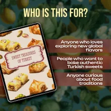 Turn your kitchen into a Turkish patisserie and surprise your friends and family with desserts that carry centuries of tradition. Download Sweet Treasures of Turkey today and start your flavorful journey into baklava, Turkish delight, halva, and more. Your next favorite dessert tradition is just one click away!