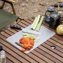 Made from high-grade titanium, this cutting board is tough enough to take on meat, vegetables, and everything in between, yet light enough to carry on your next camping trip. Its one-piece design means no joints or cracks—just a smooth, seamless surface that’s incredibly easy to clean. Whether you’re cooking over a campfire or slicing fresh produce in your kitchen, this cutting board makes the experience cleaner, faster, and more enjoyable.