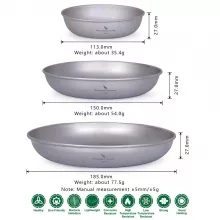 Take your outdoor dining to the next level with this ultralight 3-piece titanium plate set. Designed for hikers, backpackers, and campers who prioritize minimal weight without compromising on durability, this mess kit is a reliable companion for any wilderness escape. With three versatile sizes, this set offers the perfect solution for meals on the go — whether you’re cooking by the campfire, prepping trail snacks, or enjoying a hearty campsite dinner.