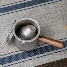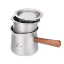 Crafted from high-quality titanium, this single-layer coffee mug is built to handle the heat—yes, even boiling water—while staying lightweight enough to carry anywhere. The included strainer makes it easy to steep your favorite tea or prepare pour-over coffee right at your campsite. Its round, sleek design fits comfortably in your hand, and the natural wooden handle stays cool to the touch, giving it an elegant yet practical edge.