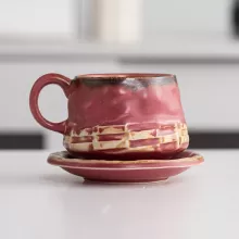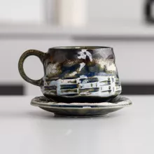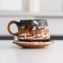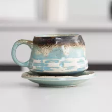 Vintage Kiln Glazed Ceramic Coffee Mug with Saucer